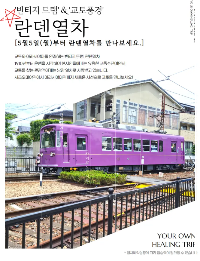 오사카로의 복귀 시간도 비교적 빨라서, 교토에서 돌아온 저녁에 야끼니꾸를 먹거나 쇼핑을 즐길 시간도 넉넉할 것 같았어요. 거기에다 교토의 운치를 더해줄 보라색 감성 '란덴 열차'까지 탈 수 있으니까 선택하지 않을 이유가 없었습니다.