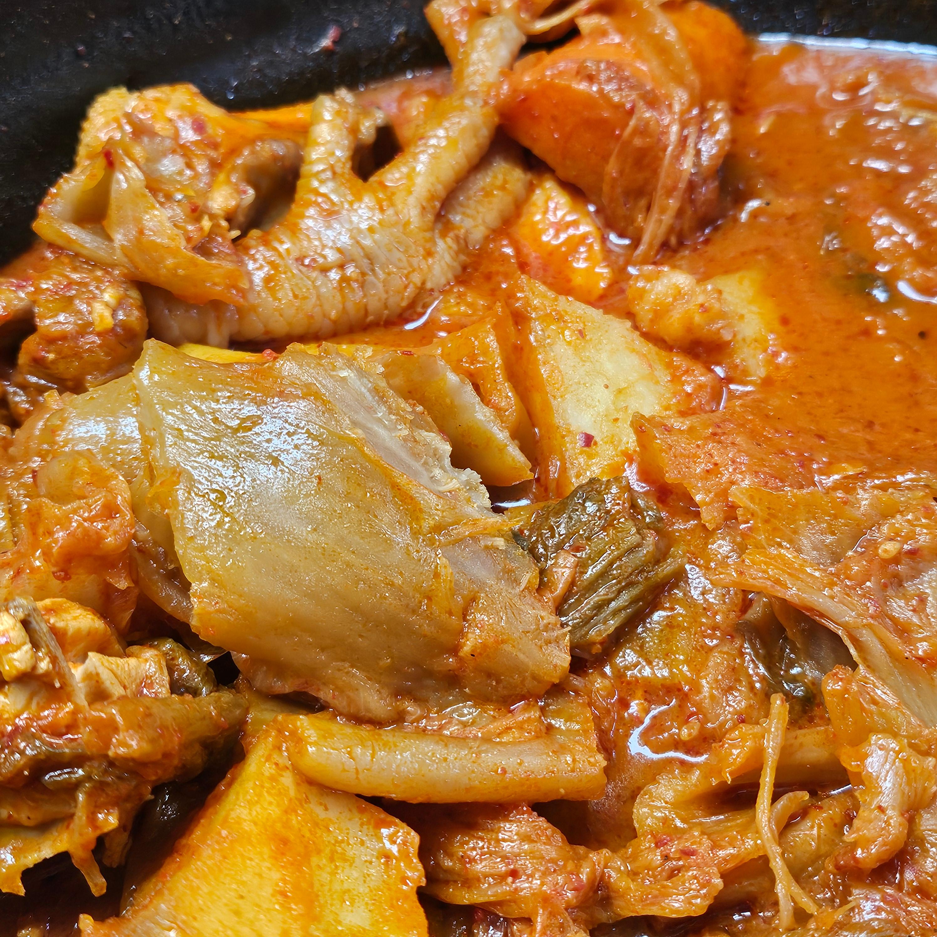 큼직한 토종닭 1마리 / 푹 익은 묵은지 3~4포기 / 커다란 감자 / 닭발까지 들어간 리얼 한 마리 !