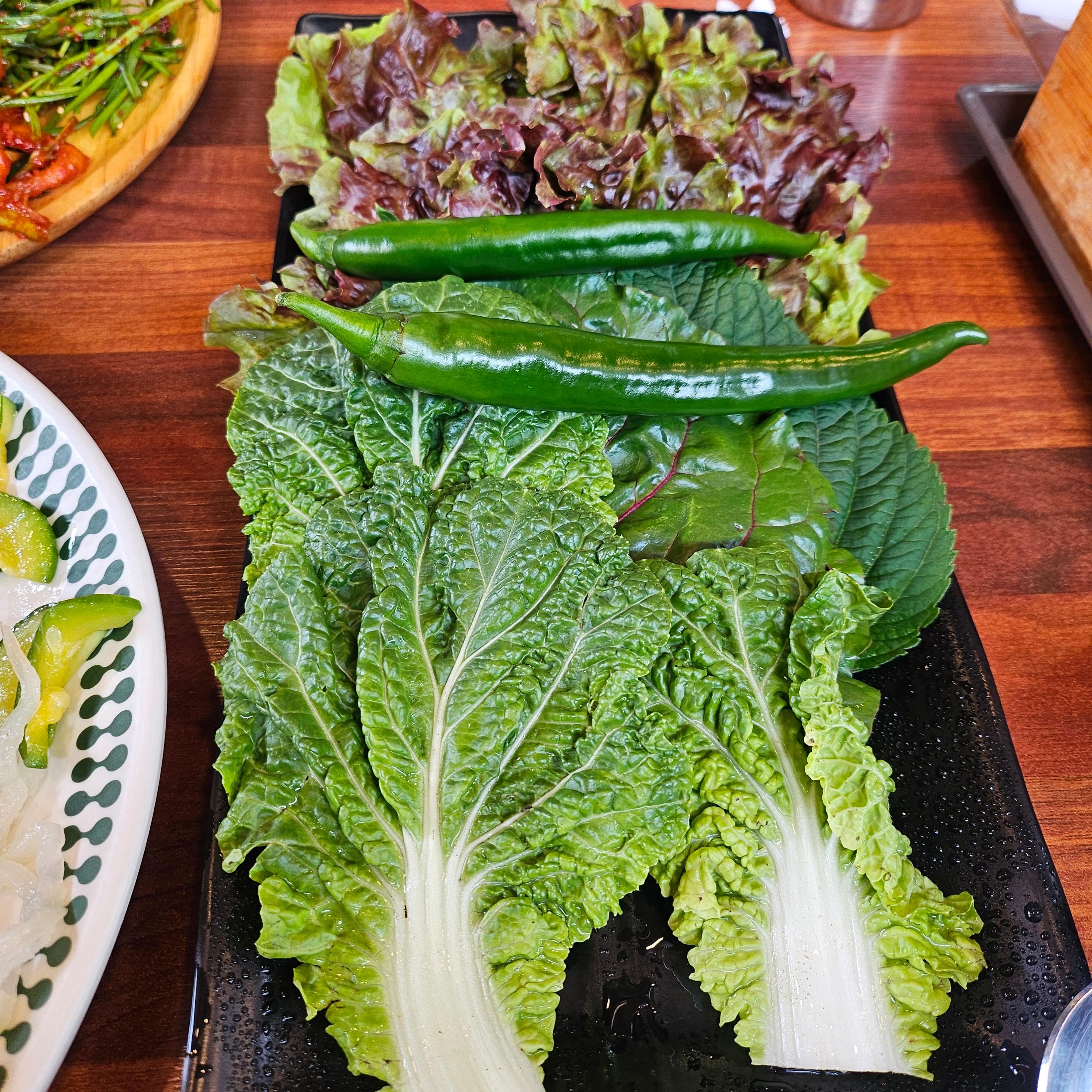 그리고 대망의 수육! 촉촉하게 잘 삶아진 수육은 싱싱한 쌈 채소와 함께 싸 먹으니 그 맛이 배가 되었어요. 쌈 채소도 넉넉하게 제공해주셔서 맘껏 먹었답니다. 솔직히 말하면...제가 제일 많이 먹은 것 같네요. 하하..