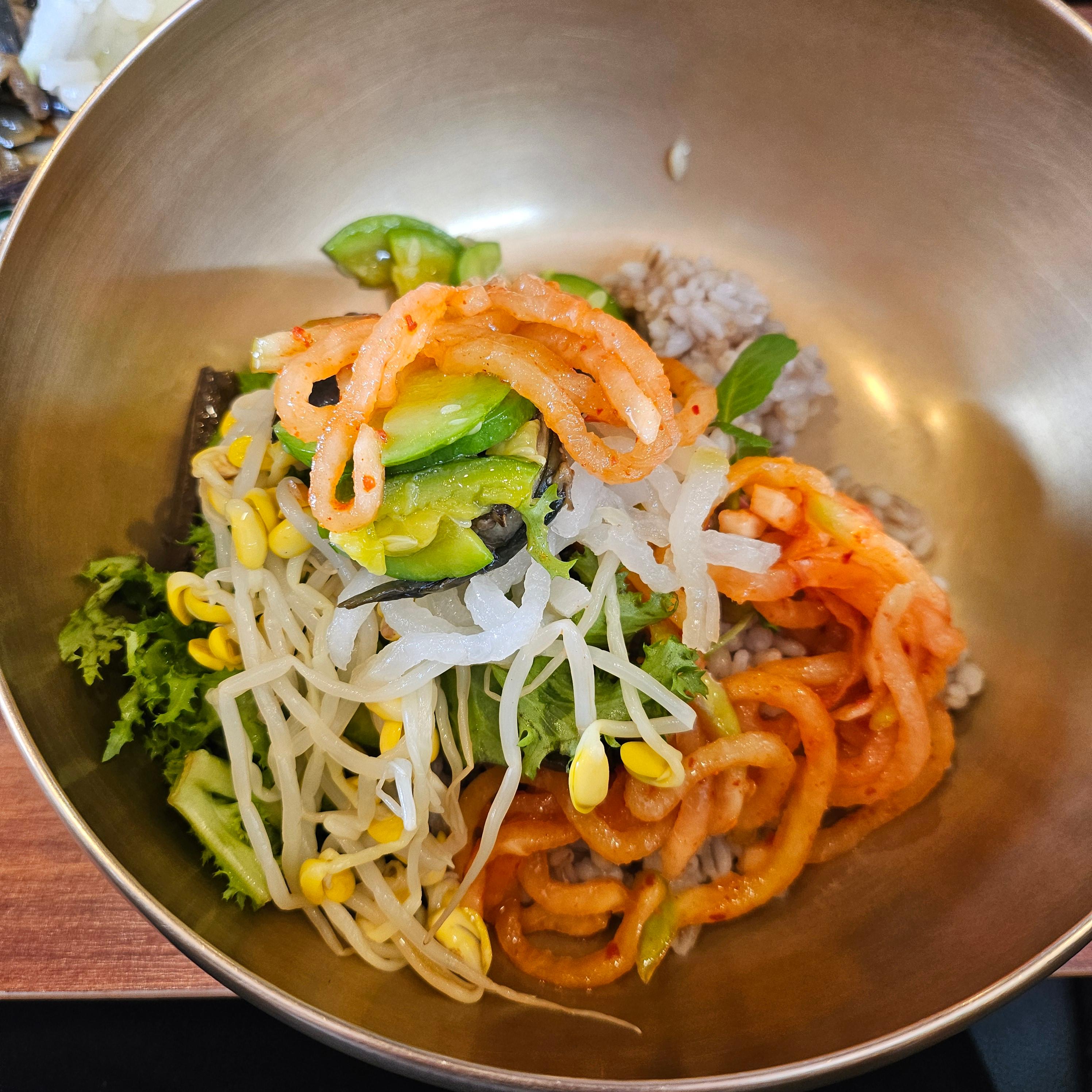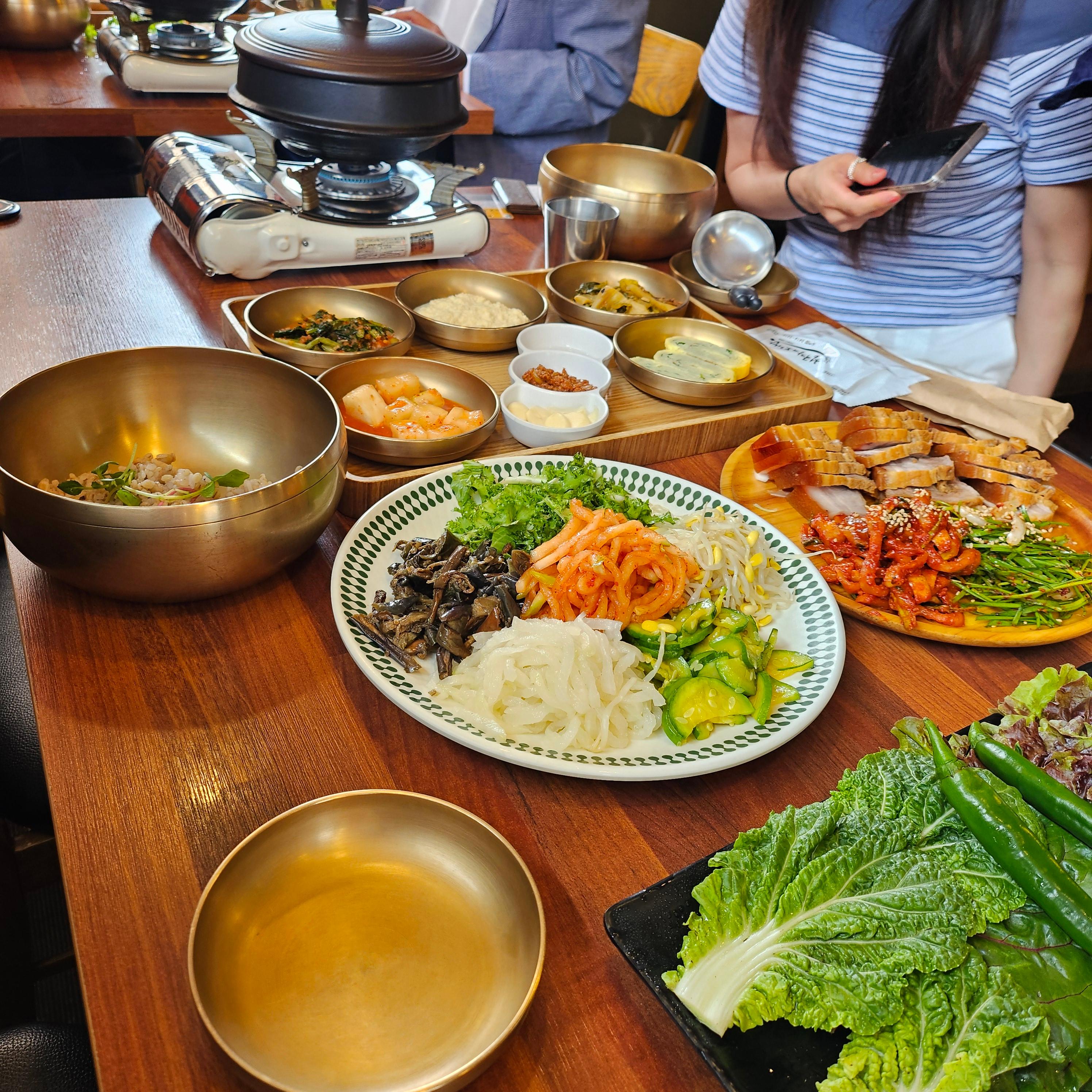 그리고 메인이라 할 수 있는 보리밥! 무생채, 콩나물, 애호박, 가지나물, 무나물, 신선한 치커리까지 알록달록한 나무들이 한가득 나왔어요. 보리밥에 이 나물들을 듬뿍 넣고 고추장과 참기름을 슥슥 비벼서 한 숟갈 먹으면...입안 가득 행복해집니다.