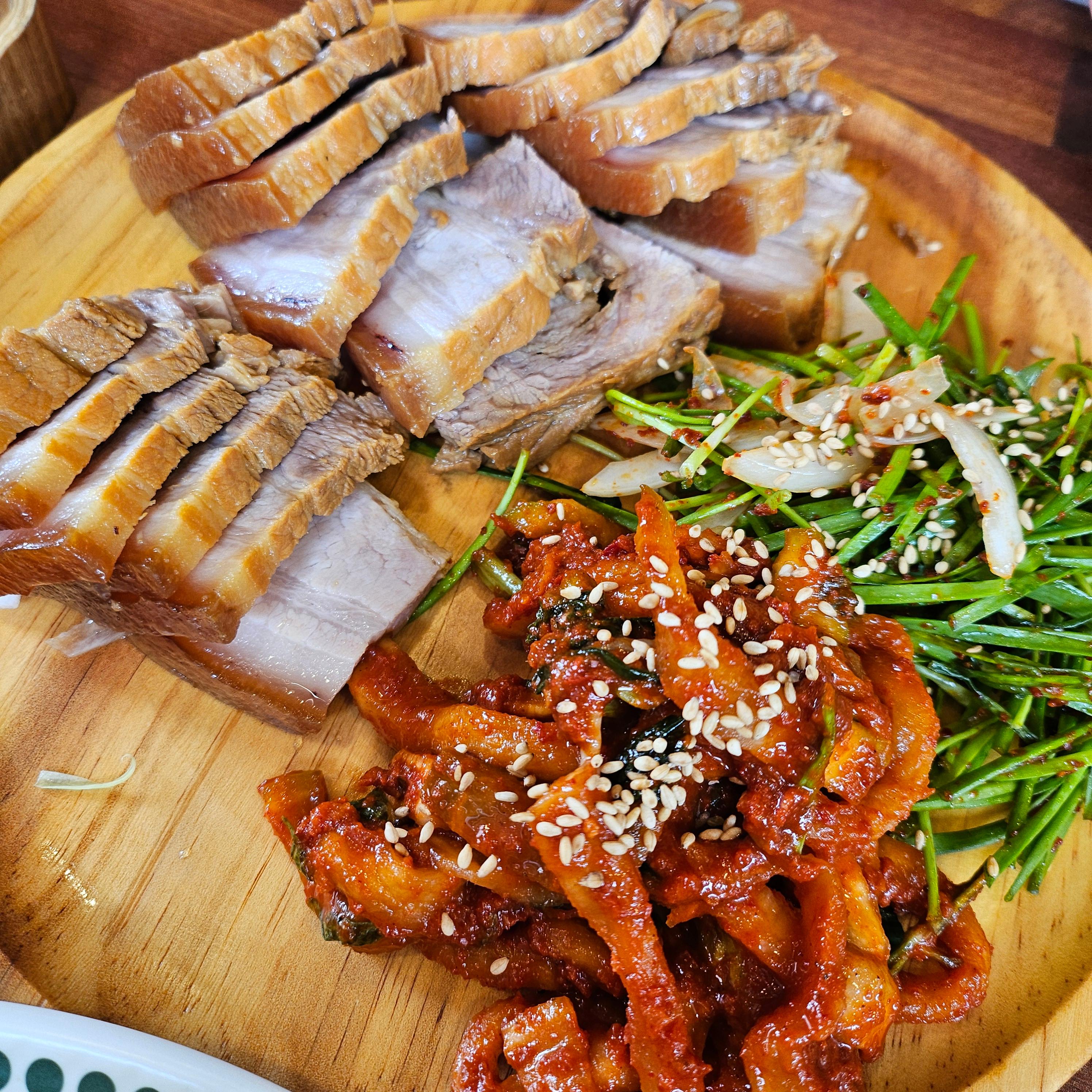 저희는 3명이서 방문해서 수육정식 3인분을 주문했어요. 상차림부터 정말 정갈하고 푸짐해서 군침이 흘렀답니다. 열무김치, 깍두기, 부드러운 계란말이, 고소한 콩비지 등 정성 가득한 반찬들이 식욕을 샘솟게 하더라고요.