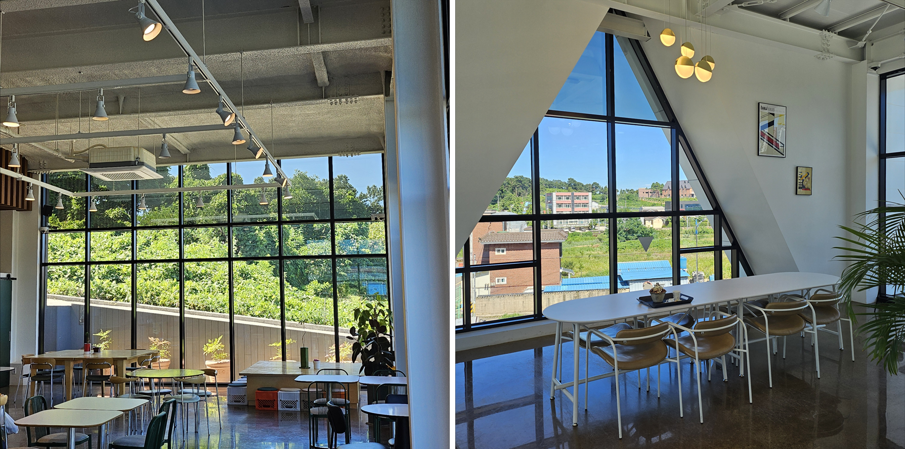 '카페 더블유'는 첫인상부터 강렬합니다. 전체적으로 삼각형 형태의 유리 건물 디자인은 주변 풍경과 어우러지면서도 독특한 존재감을 뽐냅니다. 1층부터 2층까지 시원하게 뚫린 통창은 외부의 풍부한 햇살을 내부로 가득 끌어들여 공간 전체를 더욱 밝고 따뜻하게 만들어줍니다.